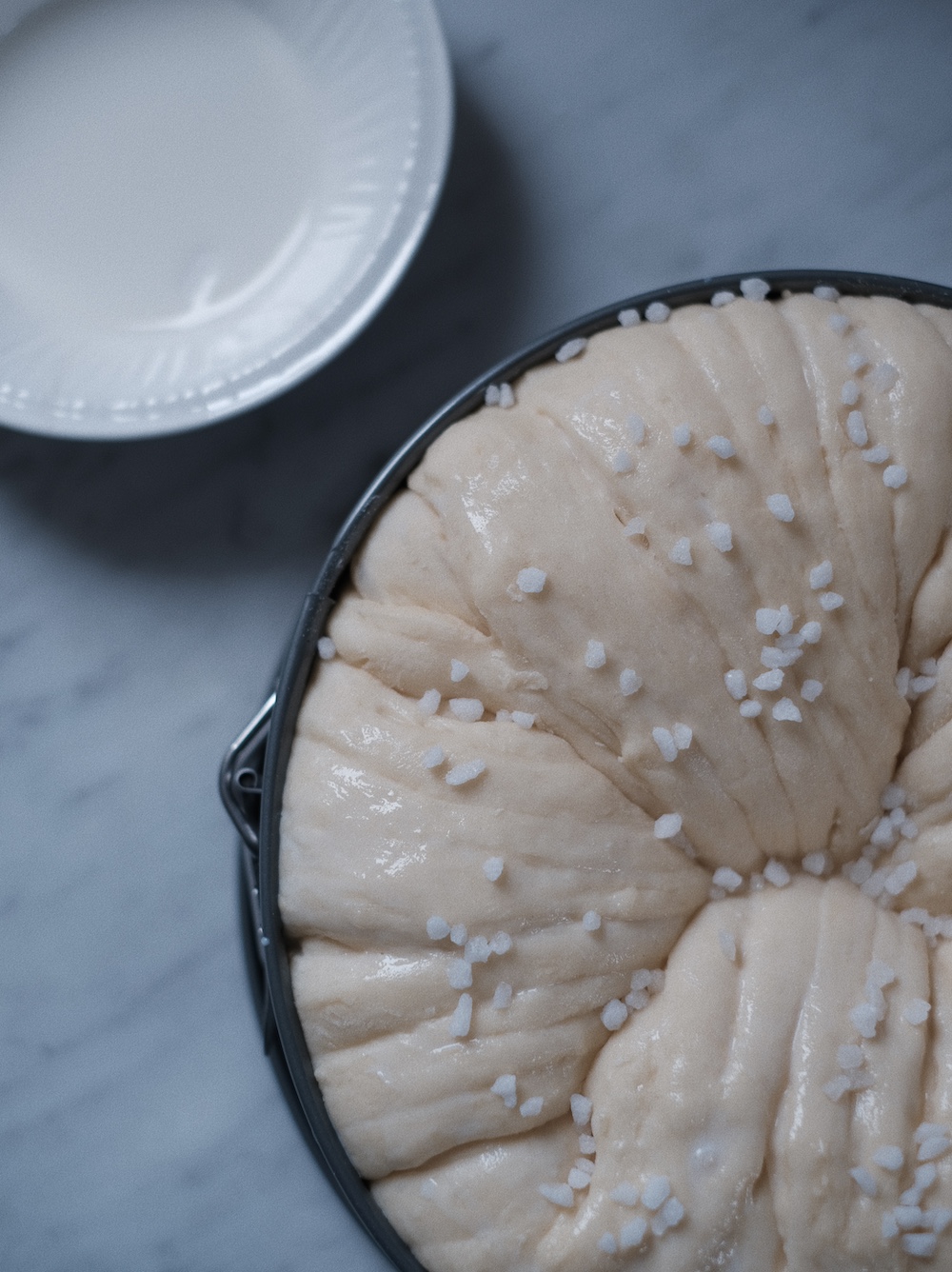 Commencer par délayer la levure avec le lait afin d'avoir un mélange homogène. Je le fais dans le saladier de mon robot. Ajouter ensuite la farine, le lait, les oeufs, le sucre, le sel et la crème fraiche. Pétrir la pate environ une dizaine de minutes à vitesse lente. Couvrir la préparation ensuite et la laisser reposer 1h30 à température ambiante, proche d'une source de chaleur. La pâte aura alors bien gonflé. Il est temps de la dégazer avec le poing. La diviser ensuite en 4 boules égales sur un plan de travail fariné. Façonner les 4 boules de pates en forme de rectangle et découper alors les 2/3 du rectangle en fines lanières avant de les rouler ensuite en boudin que vous disposerez dans un moule rond, idéalement à charnière pour le démouler encore plus facilement.
